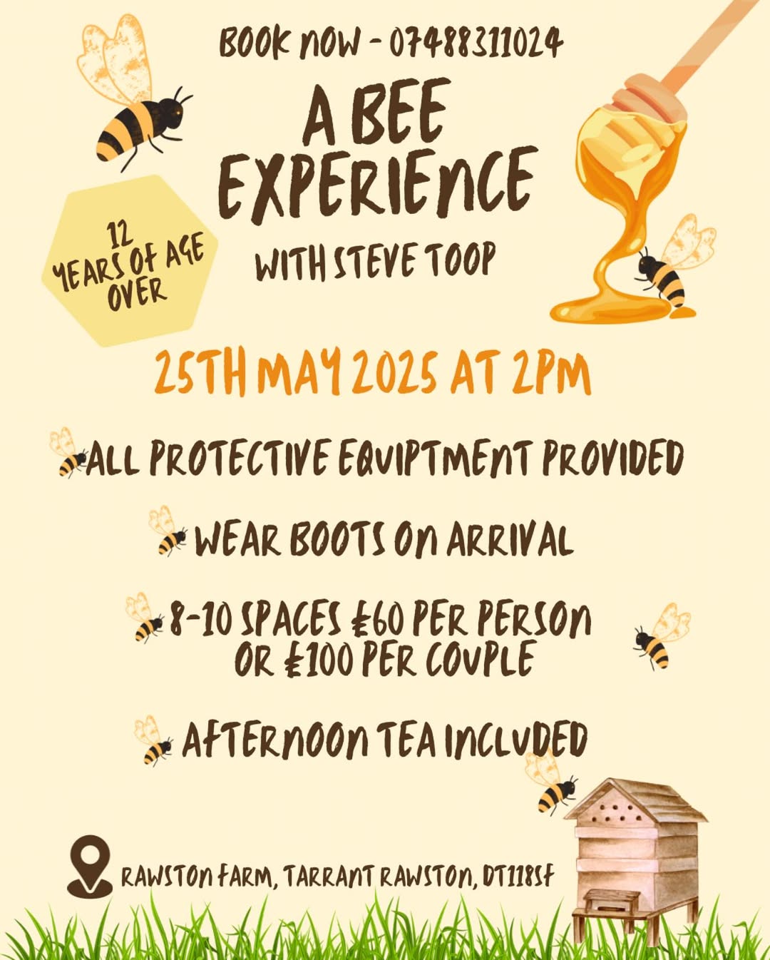 Last one of the season! Spend the afternoon with beekeeper Steve Toop – all protective gear will be provided, but please do wear boots!Maximum ten people in the group – £60 per person or £100 per couple, and a delicious afternoon tea is included! RAWSTON FARM, TARRANT RAWSTON, DT11 8SF.BOOK NO